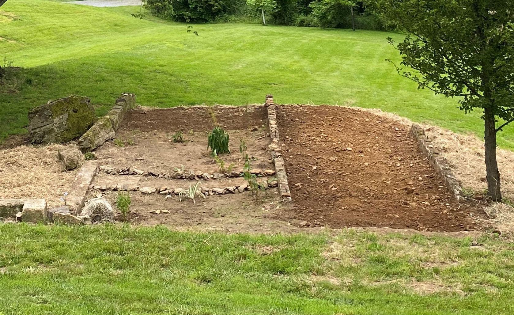 During metal detecting around the old dairy barn foundation, several volunteers decided to clear away some of the overgrowth. This led to a full blown clean-up project with the help of the township maintenance crew. What an amazing difference! We have decided to make the inside of the foundation a flower garden.