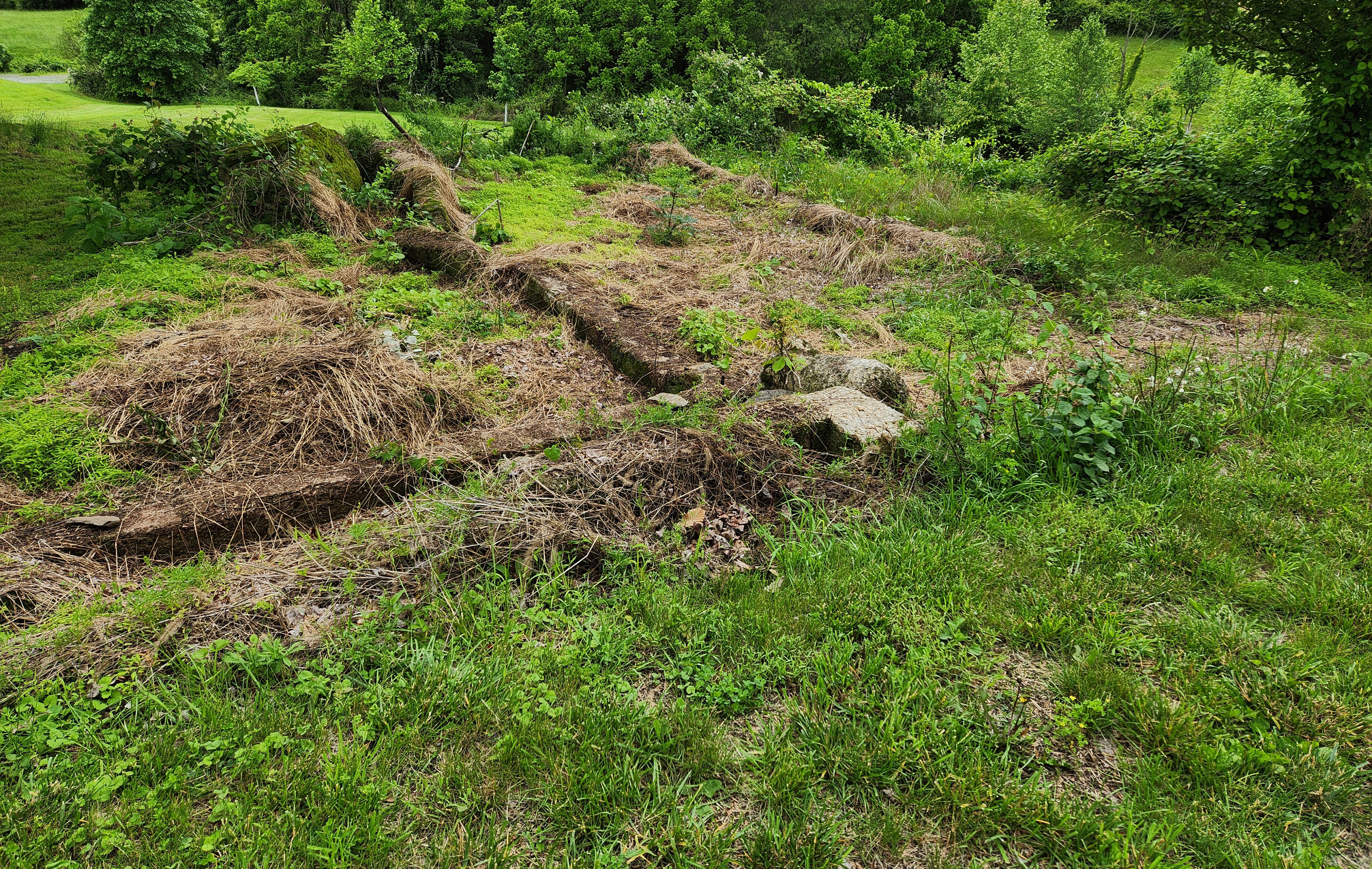 The old dairy barn walls were barely visible due to decades of overgrowth. The cow shed, built in 1856, extended from the main barn (which is partly where the upper parking area is now). When Chester County took ownership of the property in the late 1950s, they tore the dairy barn down. In May, a volunteer was metal detecting around the barn foundation and decided to clear away some of the overgrowth. This led to a full blown clean-up project with the help of the township maintenance crew. The cleared area will be a flower garden for all to enjoy. Below are before and after photos of the foundation clearing.
