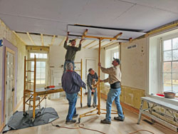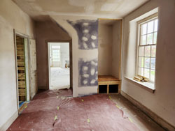 We have been awarded a Keystone Construction Grant by the Pennsylvania Historical and Museum Commission (PHMC) to refurbish the plaster in the c. 1841 Gathering Room at Barnard Station. As with any original material, movement of the structure and moisture intrusion has decayed the plaster system over the past 184 years. The causes of these problems have been addressed so the time has come to repair the internal finishes. The contractor will employ both traditional and modern methods to prepare the walls and ceiling for layers of a wet plaster system. The room was initially plastered in 1841 and has at least one subsequent layer applied to the walls. The bond between those layers has been compromised and the finish has started to break off.
